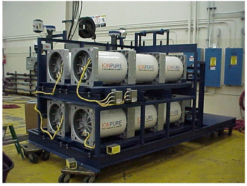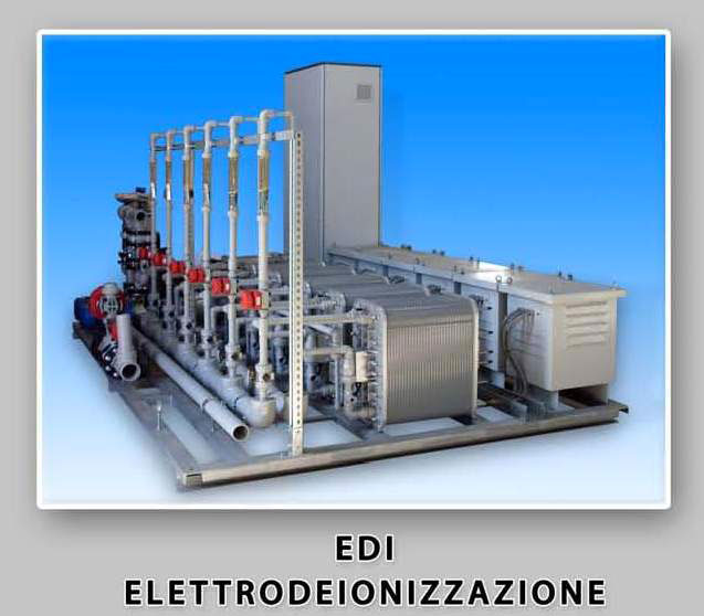 Nella parte terminale di questo canale, dove l'acqua è priva di ioni, si ha all'interno del campo elettrico la scissione dell'H20, e gli ioni H+ e OH- formatisi rigenerano le resine. Il modulo funziona quindi come un'unità a scambio ionico con rigenerazione in continuo.