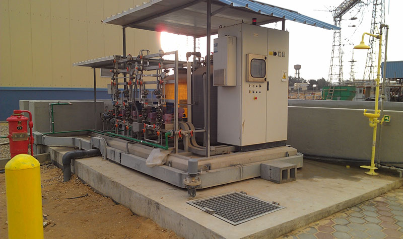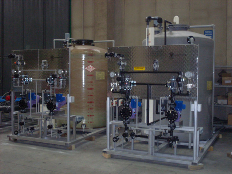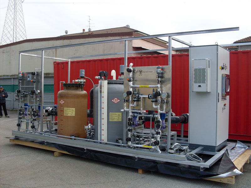 Scopo dell’impianto è la neutralizzazione degli scarichi acidi ed alcalini provenienti dagli impianti di demineralizzazione che vengono fatti affluire in un serbatoio di stoccaggio ove, a mezzo pompa, vengono tra loro miscelati. Tramite un pH-metro, che rileva il valore del pH così ottenuto, si ha il consenso, a mezzo pompa dosatrice, di iniettare il prodotto neutralizzante. raggiunta la neutralizzazione, il pH-metro da il consenso allo svuotamento del serbatoio e alla immissione in fognatura con la stessa pompa di ricircolo.