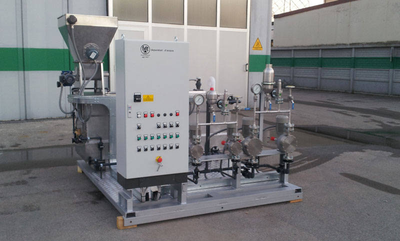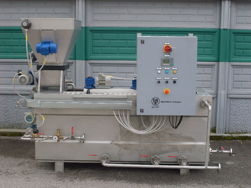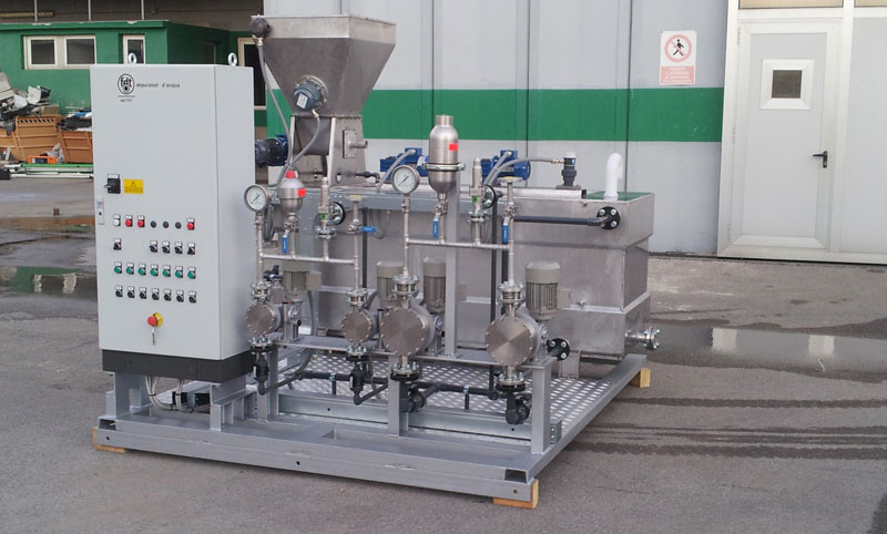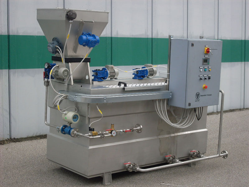 Il prodotto in polvere, tramite una coclea, viene dosato e premiscelato con l'acqua all'interno di una prima vasca di preparazione dotata di agitatore. La soluzione così ottenuta passerà, tramite appositi stramazzi, dalla prima alla seconda vasca (maturazione), per poi passare alla terza (accumulo), quest'ultima dotata di troppo pieno regolabile e sonde di livello per il funzionamento automatico. Ciascuna vasca è dotata di agitatori per mantenere la soluzione omogenea e di scarichi sul fondo per assicurare lo svuotamento di tutti i comparti in caso di necessità.